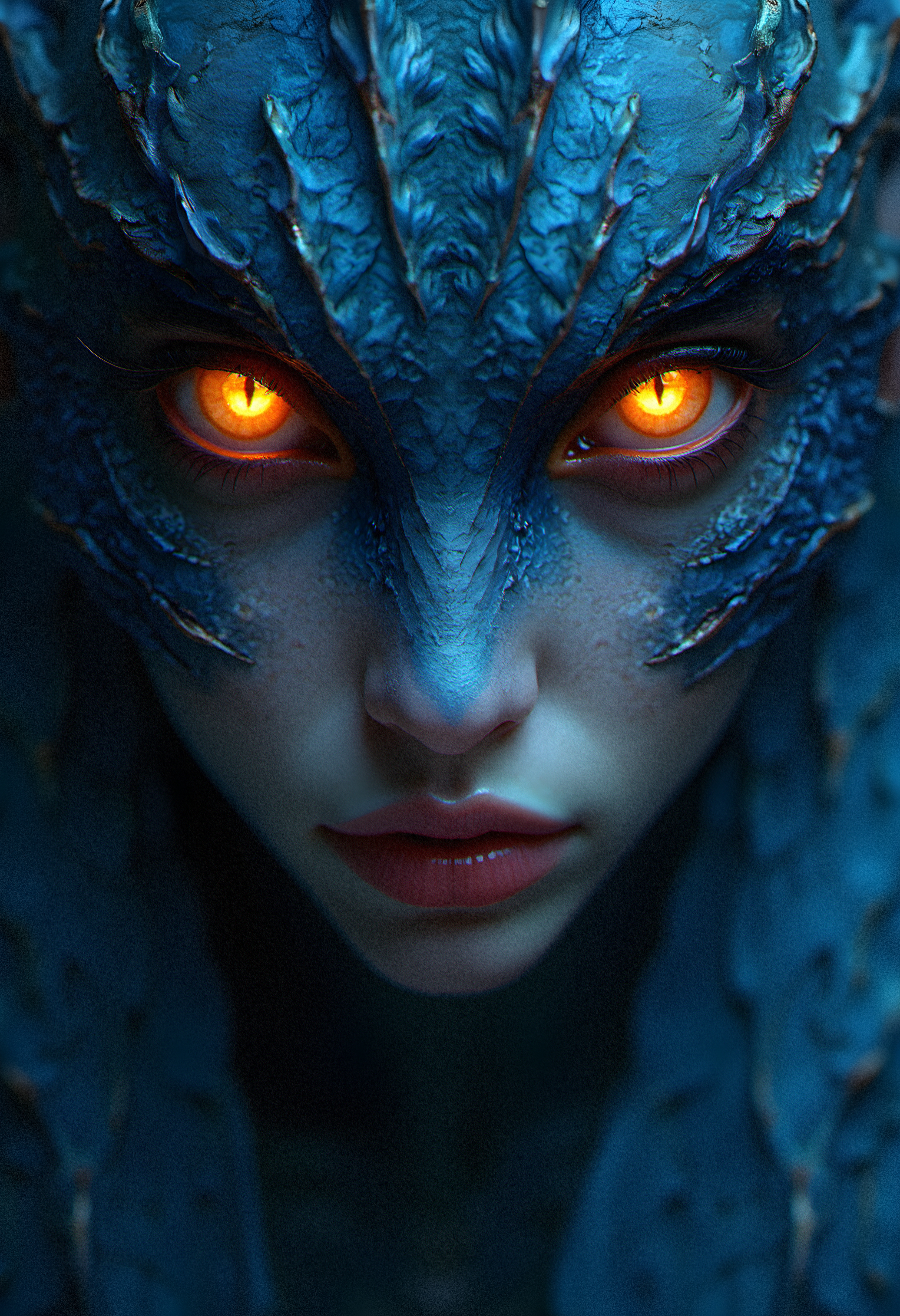 ethereal fantasy concept art of extreme closeup, beautiful woman with six eyes staring into your soul, glowing eyes, cold expression, wither, lost kingdom, eternal, scales, reptile features, ,dark blue, grimace . magnificent, celestial, ethereal, painterly, epic, majestic, magical, fantasy art, cover art, dreamy