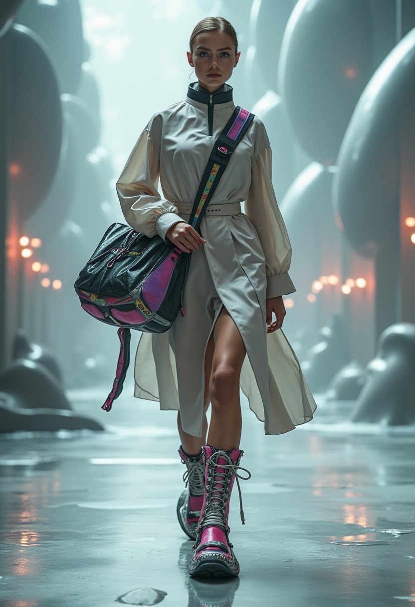 Style: High-fashion, surreal, and bold Scene: A striking Balenciaga model confidently walks down a surreal runway, wearing the avant-garde, futuristic shoes from the earlier prompt—an eccentric mix of inflatable elements, vibrant coils, and glossy reflective surfaces. She’s carrying an oversized, iconic designer bag, just like the one in the image, slung effortlessly over her shoulder. The exaggerated size of the bag contrasts with the model's sleek, minimalistic outfit, creating a visually captivating statement piece. Model: A tall, statuesque figure with a sharp, commanding presence. Her hair is pulled back into a sleek ponytail, and she wears bold, minimalistic makeup that highlights her strong features. Her expression is focused and intense, exuding confidence and control. Mood: Surreal, bold, and futuristic—a blend of high fashion with playful, exaggerated elements. Background: The runway is set in a surreal, dreamlike environment. The floor is a vast expanse of reflective, liquid-like metal that ripples as the model walks. The walls are composed of floating geometric shapes and oversized, abstract sculptures that change colors and shapes in response to the model’s movements, creating a constantly shifting, otherworldly atmosphere.