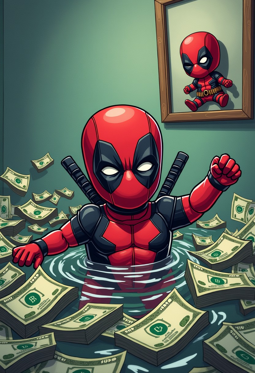1 man, Adult costumed Deadpool swimming in a pile of money, 1 chibi man, Chibi deadpool in corner frame, funny composition comic art