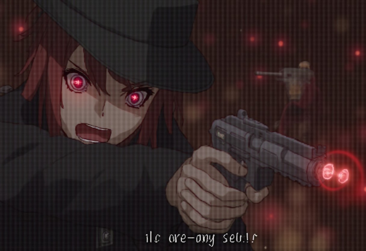 An illustration of an anime or manga-style character wearing a hat and aiming a gun with laser sights. The character has an intense, focused expression, with glowing red eyes suggesting they may be using some kind of special ability or power. The illuminated red sights on the gun and the blurred red lights in the background contribute to a tense, action-oriented atmosphere. The caption "I'll get him, give me a sec." implies the character is pursuing or about to confront someone. The overall style and composition conveys an intense, dramatic moment likely from an action or sci-fi anime, manga, or video game scene.