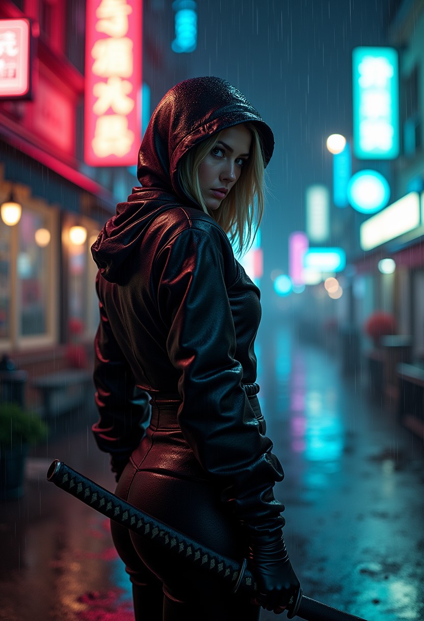 closeup portrait of a stunning, gorgeous cyberpunk ninja with blonde hair wielding a katana walking on a cyberpunk street at night in the pouring rain, with neon signs, puddles reflecting light. Perfect Composition, realistic photographic image, RAW photo highest quality, dutch angle, viewed from side, her looking back at the viewer from under her hood