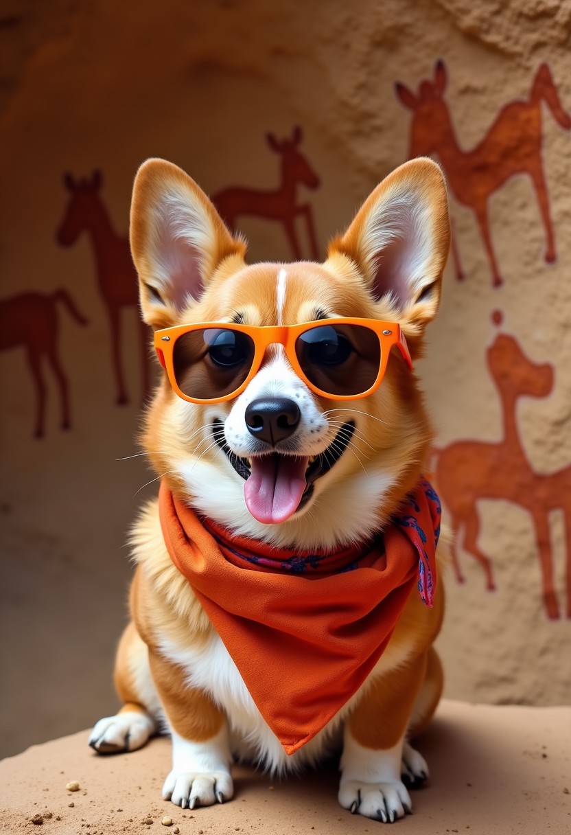 a creative composite image, with the foreground featuring a (Corgi dog) wearing (orange sunglasses) and a (vibrant scarf), looking very stylish. The background is a (cave painting) with ancient (red and orange) symbols and animal figures, taking us back to prehistoric times. The modern vibe of the Corgi contrasts sharply with the primitive feel of the cave art, as if the dog stands as a bridge between the present and the distant past, blending contemporary fashion with a hint of historical reverence. This image creates a fascinating juxtaposition of time and space, sparking the imagination.