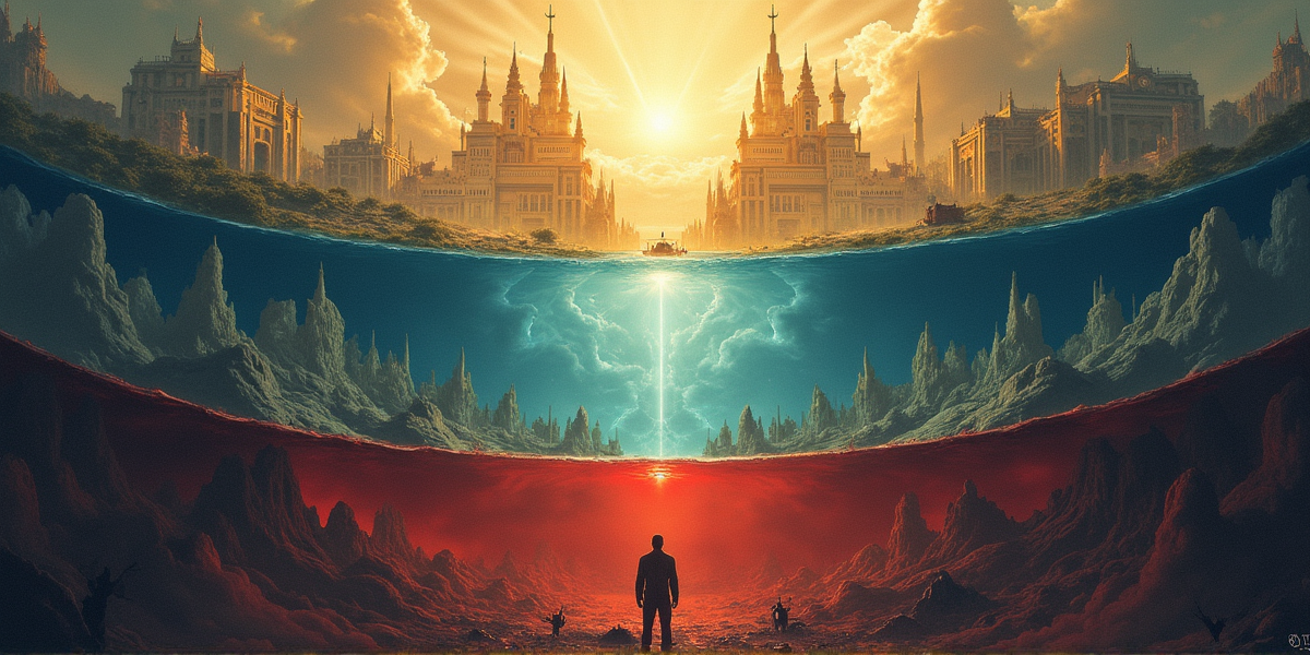 A grand 3-layered scene with 3 contrasting scenes: The upper part depicts a heavenly kingdom, showing the life scenes of the gods, surrounded by tranquility, golden tones The middle part should be themed on the human world, showing the life scenes of humans and animals, with magnificent urban architecture and mountains and rivers, blue-green tones The lower part is bloody and dark, full of death, shadow demons and skeletons, evoking a sense of foreboding, red and black tones The transitions between the parts should be seamless and unique, creating a strong visual narrative for the different levels of existence.