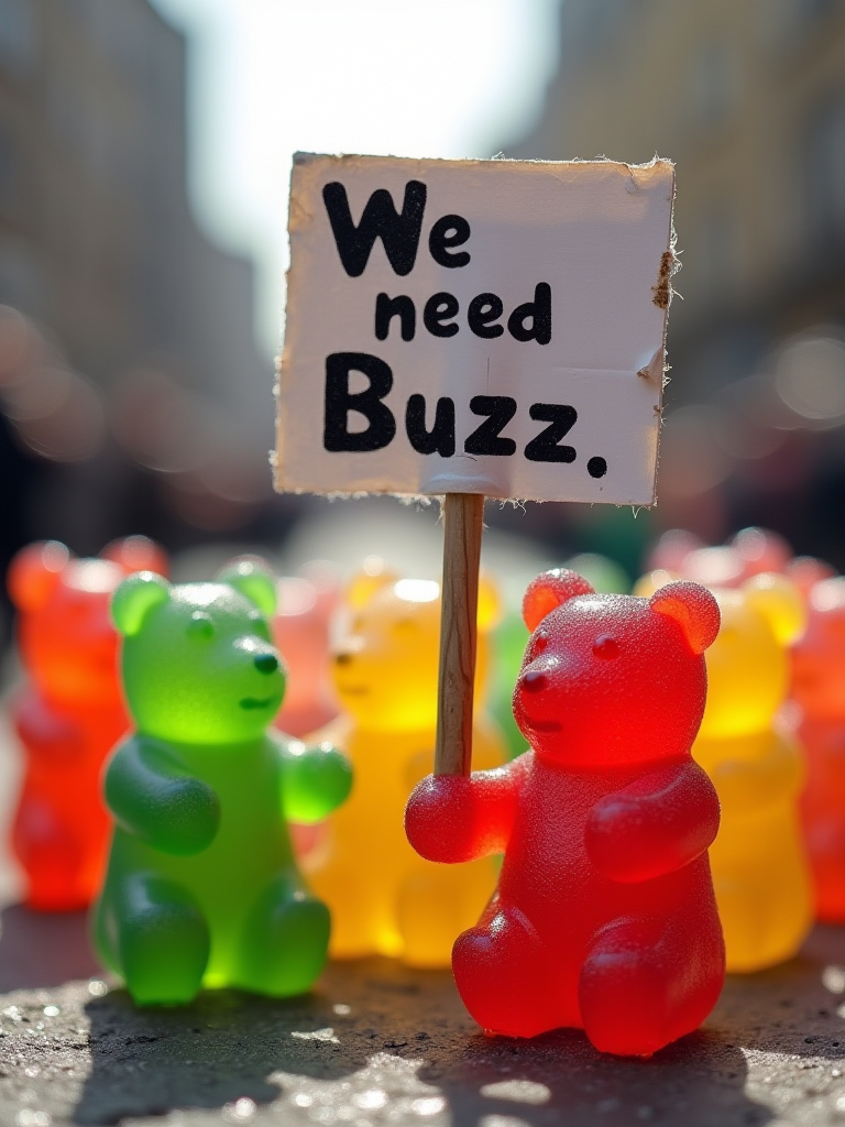 A group of colorful cute gummy bears protested on the street,Holding Up a sign with the words " We need Buzz", Cute masterpiece, wallpaper art, delicate,lovable, tiny, best, dynamic composition, magnificent, intense, perfect background,war,fighting,