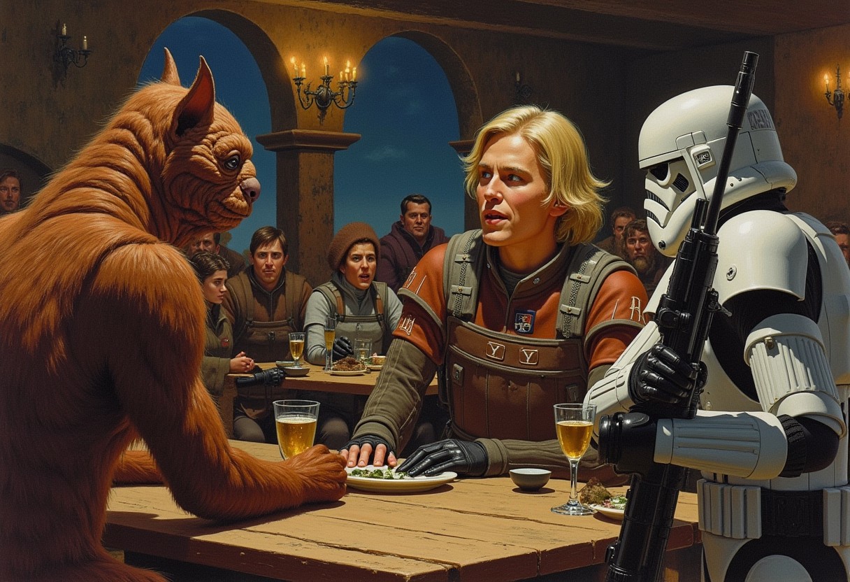 Ralph McQuarrie Style illustration of show of in a seedy retrofuturistic medieval tavern between a blonde haired pilot and a furry alien, crowded cantina looks on from the sidelines, stormtrooper stands to the side holding rifle