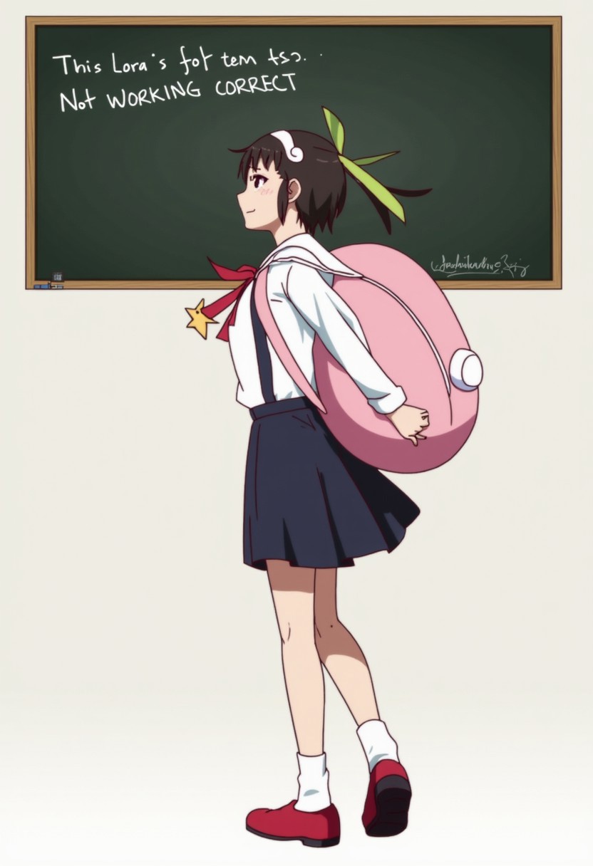 Hachikuji Mayoi, school uniform, white shirt, bag, neck ribbon, white socks, backpack, suspenders, red footwear, green ribbon, suspender skirt, pink bag. Blackboard with text: "this lora is for test. Not WORKING CORRECT"