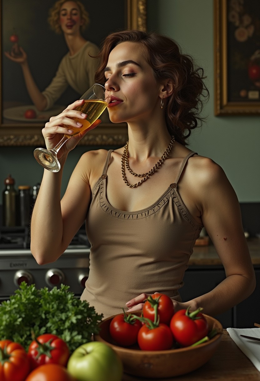 horror a kitchen veggies and Emma Watson" drinking champagne next to a painting of her in chains and honey in depth photo