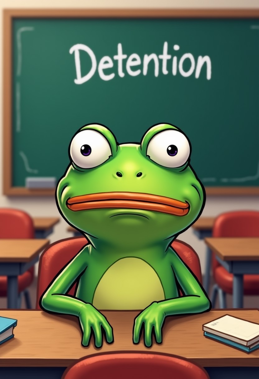 pepe the frog, bored expression in a class room. with a chalkboard in the background. The work "Detention" is written on the chalkboard. New paper comic strip style