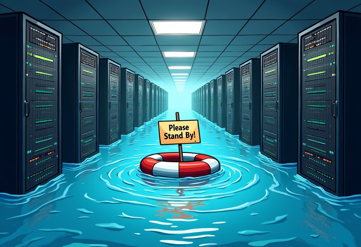 a cartoon drawing of a computer server room half flooded with water, a float in the middle with a Sign on says "Please Stand By" BREAK limited palette, masterpiece, detailed, perfect light, cinematic lighting, dynamic angle,