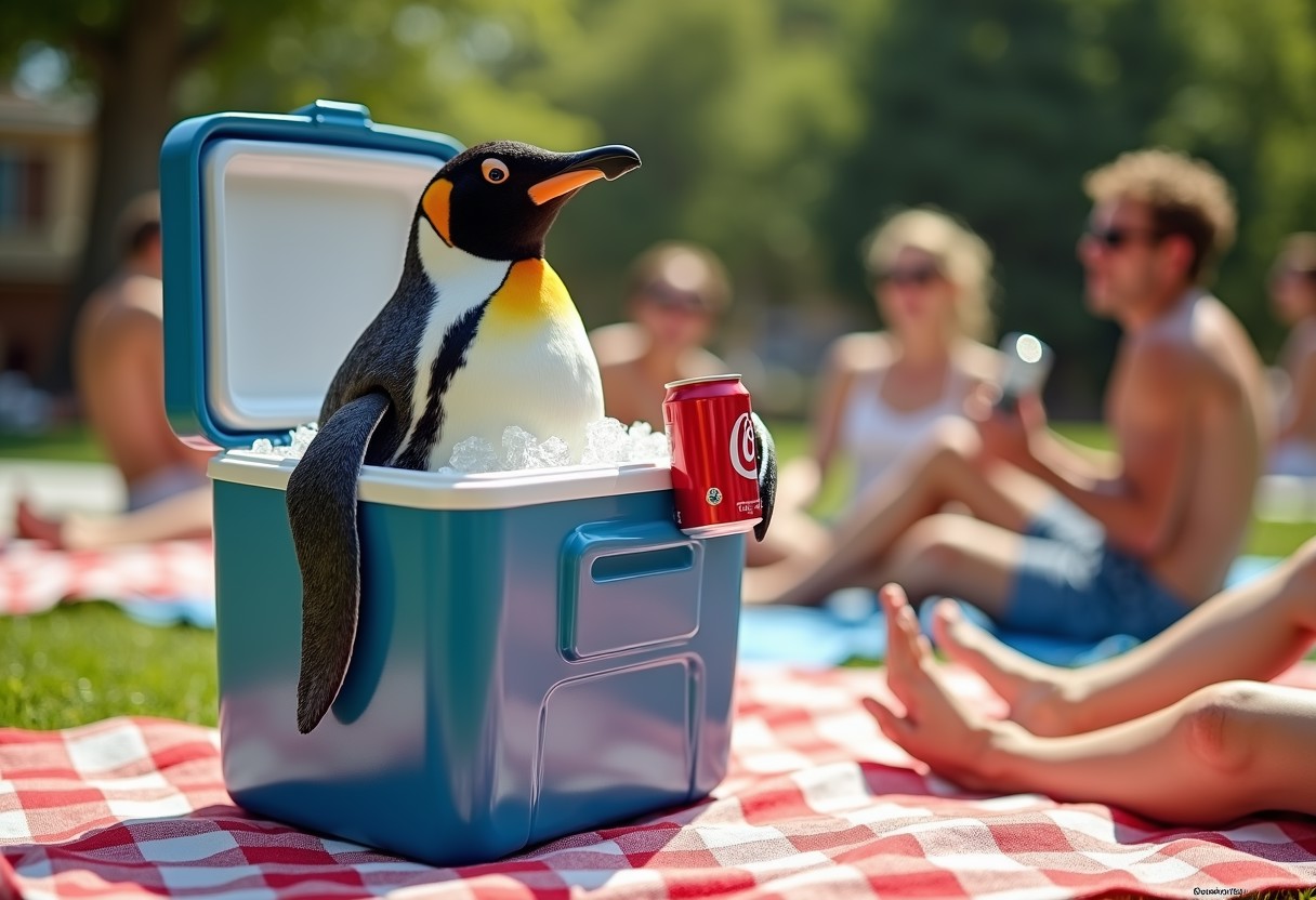 Capture a hyper-realistic photograph of a penguin with a body shaped like an ice cooler, waddling around at a summer picnic. The penguin’s back opens up like a cooler lid, revealing a stash of cold drinks and ice inside. Its flippers are holding a can of soda, and it stands cheerfully in the midst of picnic blankets and sunbathers, offering refreshments with a cool demeanor.