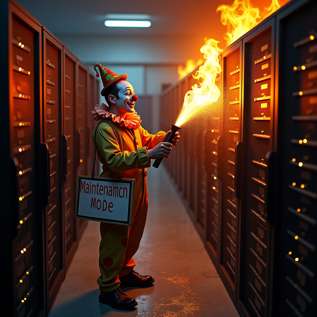 a server room on fire, a clown who has a joke flower on his lapel that sprays water and is trying to put out the fire on one of the servers with the water coming out of that flower. a sign in his hand that says "maintenance mode"