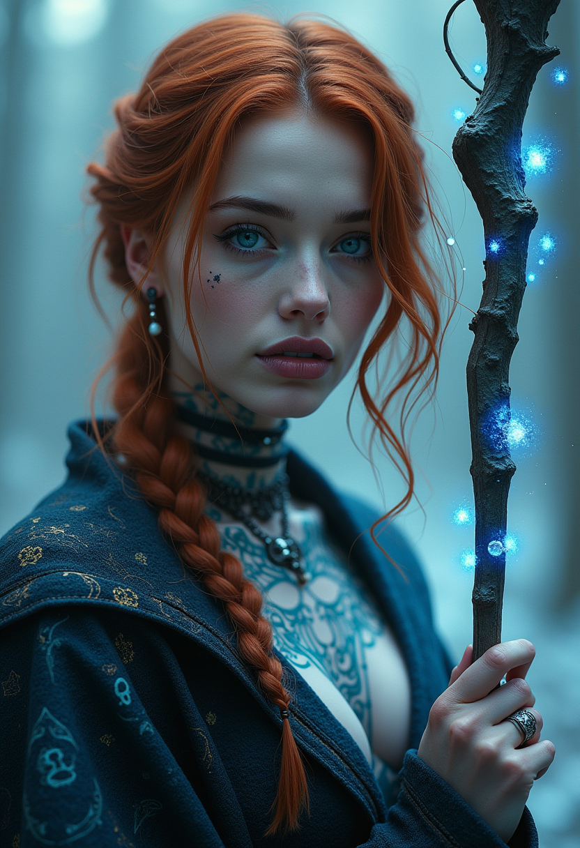 masterpiece, professional artwork, intricate details, inspired by Jeremy Mann and Tom Bagshaw, double exposure, fantasy theme, hologram, witch, arcane glowing symbols embedded into robe, runic, magical swirls, red hair, holding magical intricately detailed staff, sharp blue eyes, bioluminescent arcane tattoos, realistic pale skin texture, braided hair, misty background, black lips