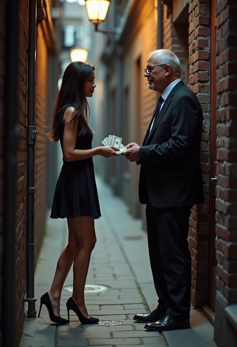 a beautiful 18yr old asian girl wearing a minidress and high heels talking to a 60yr old white man in a narrow dark alleyway. the man is handing her a wad of dollar bills