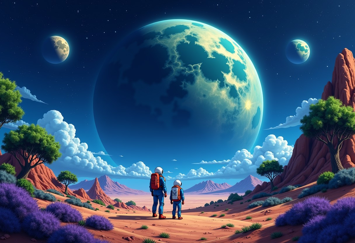 large glowing planet in the sky at night, three moons, screenshot from 80’s anime cartoon. detailed background, detailed anime background, Science fiction, sci fi anime from the 90s, alien planet, arid landscape with trees and shrubs, purple and green plants, spacesuits