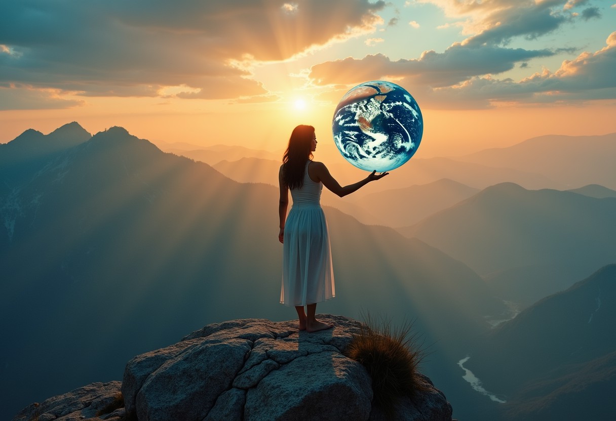 breathtaking woman standing on the top of a mountain and holds the Earth in hand and the Moon in other hand
