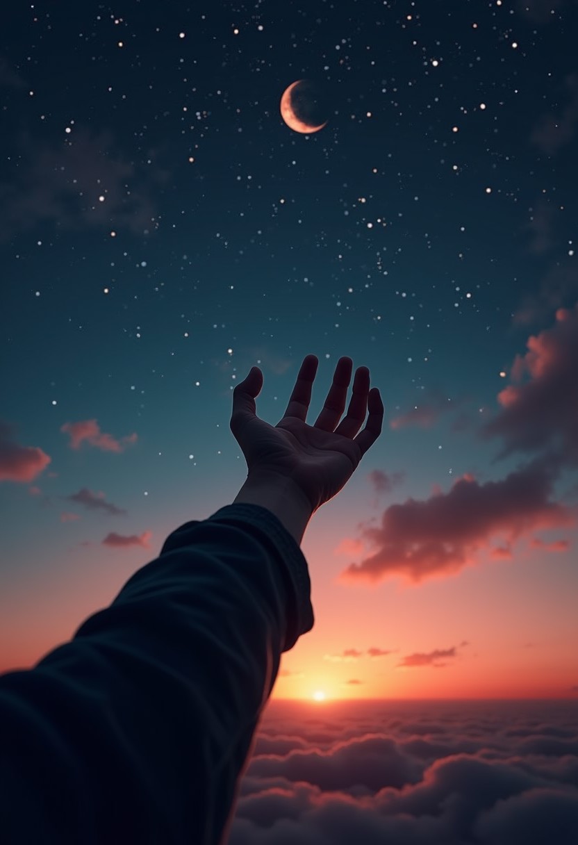 In this poetic scene, the velvet night sky is adorned with scattered stars and a crescent moon, inviting endless wonder. The horizon glows with the fading embers of sunset, painting the clouds with a subtle, serene red. In the foreground, a hand reaches towards the sky, as if striving to touch the distant stars and moon. The silhouette contrasts sharply with the light and dark, symbolizing humanity’s pursuit of dreams and longing for the universe. Fingers slightly spread, the hand seems to grasp at the fleeting meteor, wishing upon the boundless heavens. This image captures a moment of yearning and introspection, where the transition from dusk to night reflects life’s fleeting beauty and the eternal quest for the unknown.