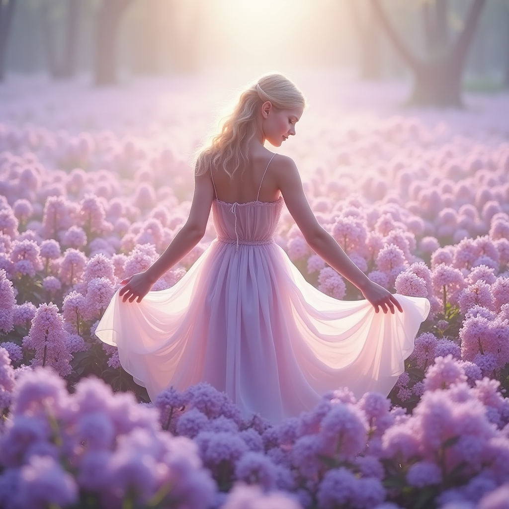 In a dreamy, enchanted land, a vast sea of pale purple flowers stretches endlessly, with light reflecting off each petal, creating an ethereal aura. In the center, a beautiful elf in a sheer, flowing gown dances gracefully, her skirt swirling like ripples of light. Her skin glows with a soft golden hue, blending seamlessly with the otherworldly surroundings.