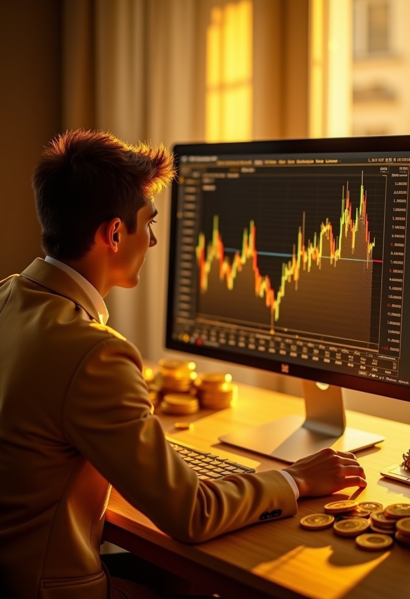 young man watching a golden monitor that shows the bitcoin chart, sunshine, daylight, young man is wearing a golden suit, golden table, golden room, piles of gold