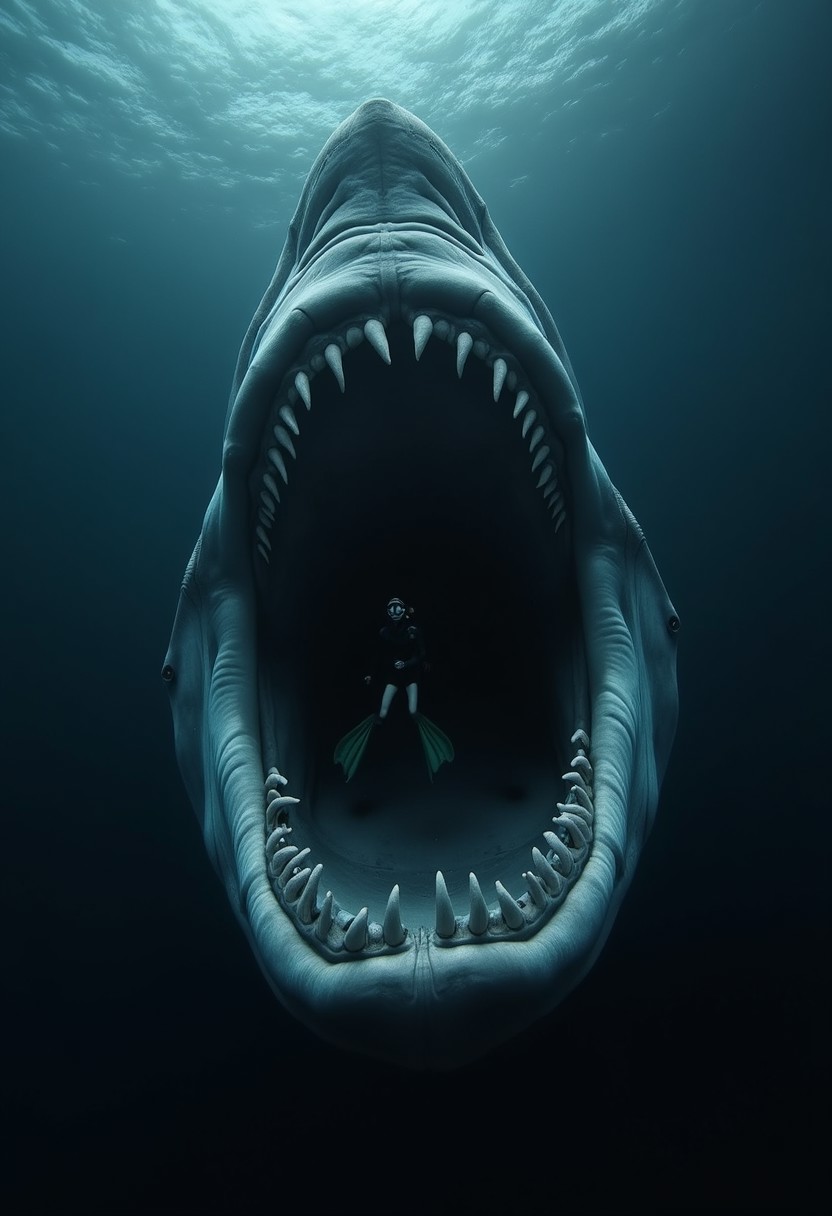 (front centered wide shot, photograph of giant open mouth, multiples rows of sharp teeth :1.2) (in rear view of a diver floating in the center), dark ocean abyss, big size difference, ocean deeps, black dark blank background, abyssal fish