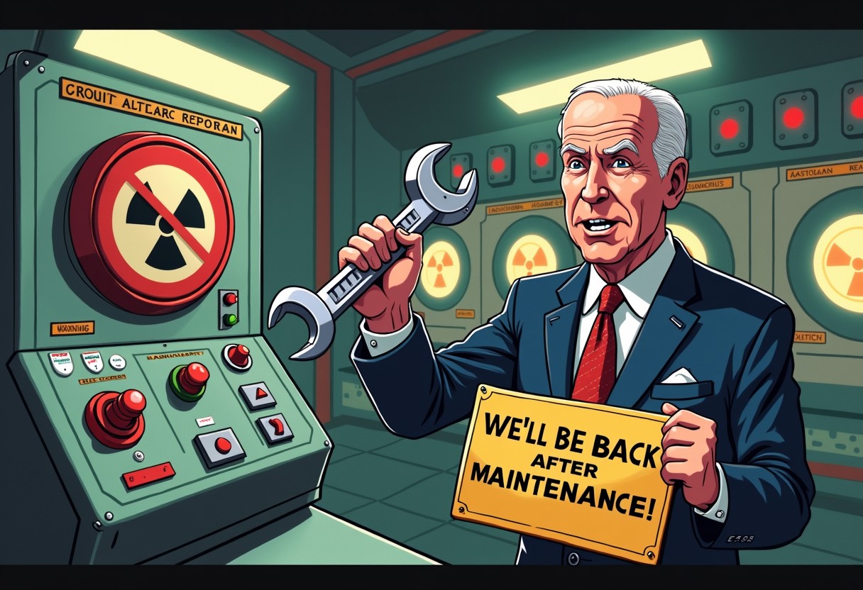 Picture President Biden in a high-stakes nuclear reactor control room, looking confused as he holds a comically oversized wrench, clearly the wrong tool for the job. Alarms are blaring, and warning lights flash, signaling an impending explosion. The reactor in the background is covered with cartoonish, oversized buttons and levers labeled 'Do Not Touch,' adding to the chaos. Biden's expression is a mix of determination and bewilderment, with his tie comically askew. A sign hangs in the foreground, reading 'We'll be back after maintenance!' in bold, playful letters. The scene is colorful and dynamic, capturing the humorous tension of a critical moment with a lighthearted twist.