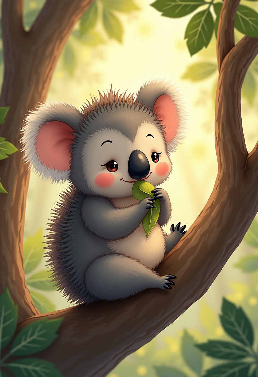 An endearing hedgehog-koala hybrid sitting in a eucalyptus tree, contentedly nibbling on a leaf. This little creature has the round, plush body of a koala, but with soft, short quills like a hedgehog on its back. Its large, round ears and the gentle, peaceful expression on its face make it irresistibly cute. It clings to the branch with its small, strong koala arms, its legs dangling playfully. The tree is surrounded by other eucalyptus trees, and the sun filters softly through the dense foliage, creating a soothing, warm atmosphere. The scene is filled with calm and cuteness, akin to the playful drawings by artist Marjolein Bastin.