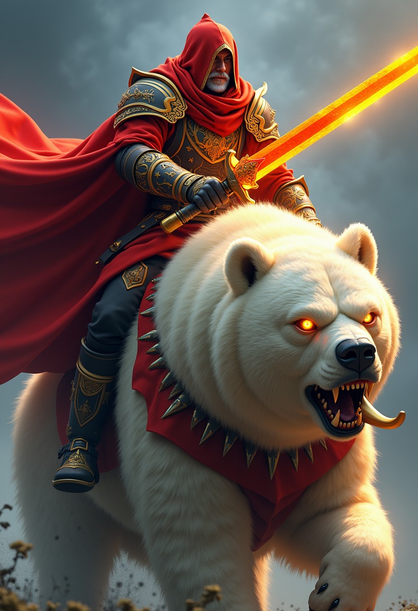 A cinematic angle digital illustration featuring a powerful duo: a slavic rider atop a fierce, mystical bear. The rider dons light, intricate felt with a striking color scheme of deep red and vibrant gold, complete with angular, sharp edges and glowing accents. Wielding a large, glowing Cossack saber with a mirrored red and gold blade, the rider is ready for battle. The bear, with a menacing expression, has white fur with patches of glowing yellow, creating a contrast that highlights its ferocity. Its eyes glow with piercing yellow light, and its fangs are bared, accentuating its aggressive demeanor. The bears's fur is adorned with spikes and armor plates that match the rider's attire. The dominant colors are dark red and white, with glowing yellow accents that add a mystical and powerful effect, illustration, poster, professional photo