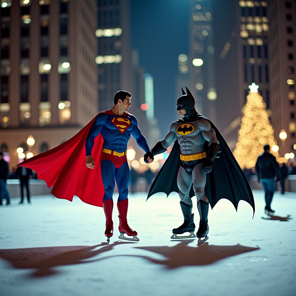 ((superman)) and ((batman)) are figure skating at the ice skate rink at rockefeller center, nighttime, vivid colors, realistic, photorealistic, high definition, film grain