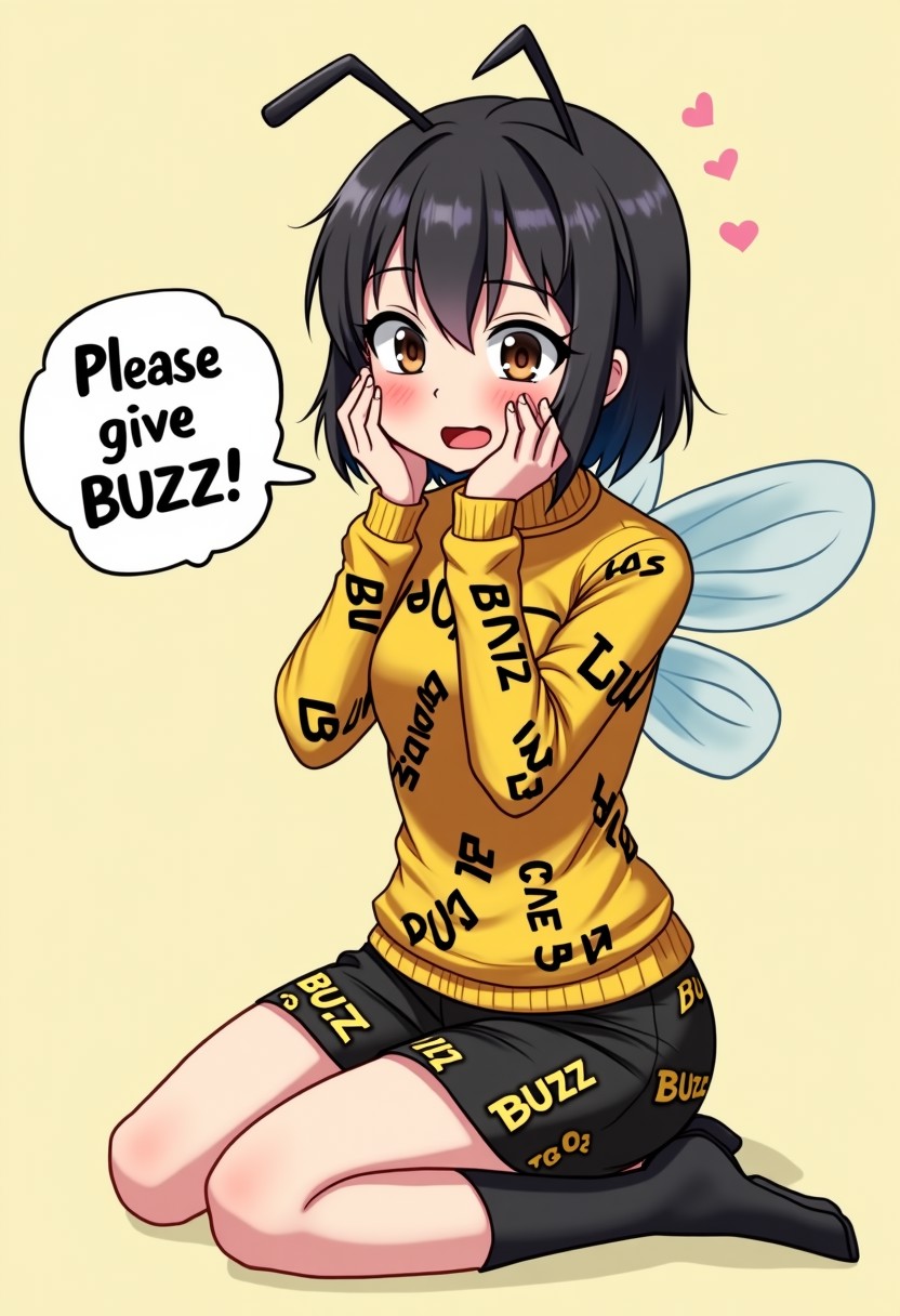 an anime woman with the words "BUZZ" painted on her many times, she is a cute bee girl, she is begging toward the camera, on her knees crying, and bubble comic text box "Please give BUZZ"