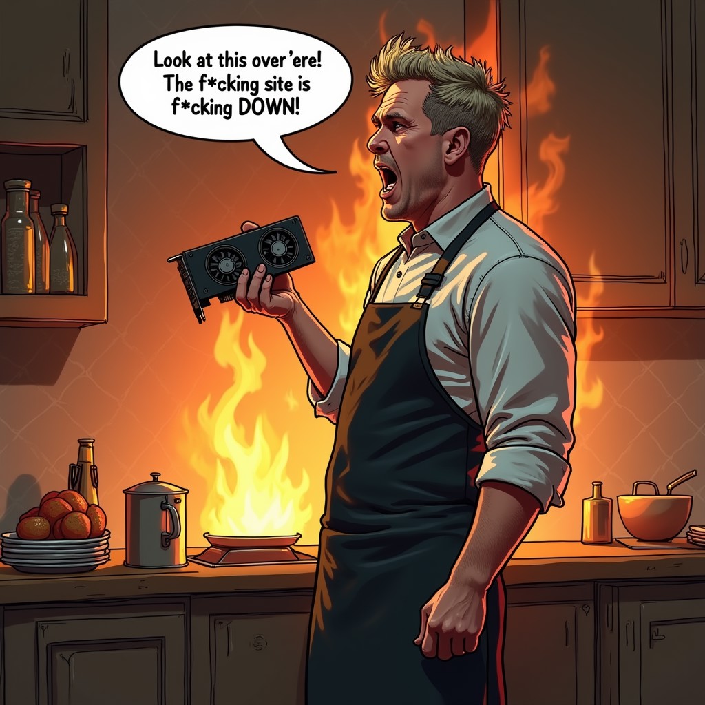 ((Text bubble "Look at this over 'ere! The f**king site is f**king DOWN!")), (raw photo), An outraged Gordon Ramsay standing in a kitchen that is in flames. He is holding a smoking video card like it is a faulty dish and yelling at a chef with admonishment.