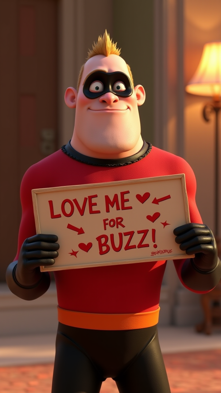 A humorous scene of a cheeky Syndrome from The Incredibles in a romantic setting, holding a sign that says "Love Me for Buzz!" with heart-shaped arrows and a playful wink.
