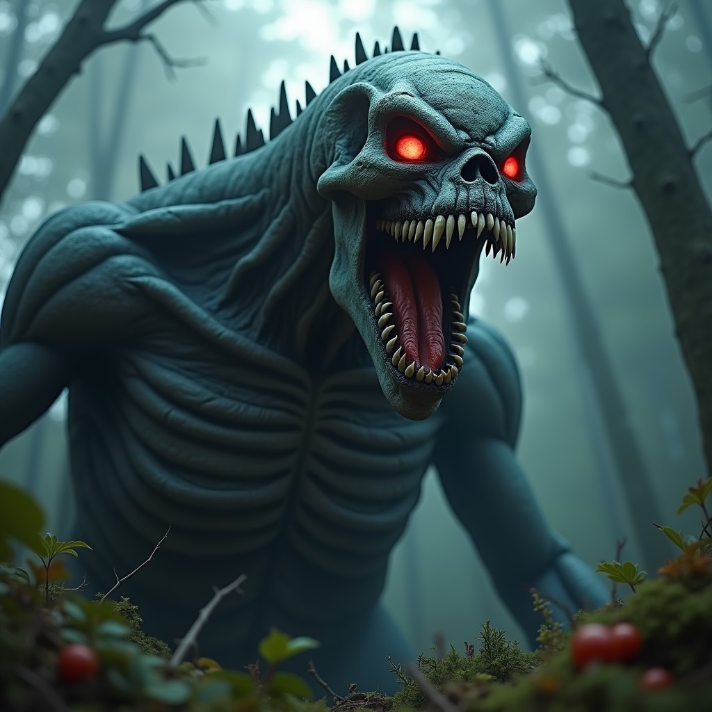 A photograph of a human sized kaiju with a skeleton face an a lighting red eyes,musculated body,open mouth with shreded tooth,cinematic,horror,perfect composition,horror atmosphere ,in the wild