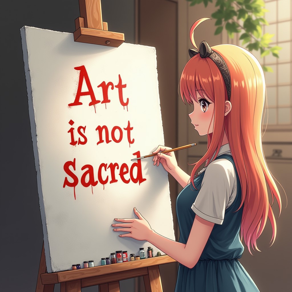 an anime girl painting on a canvas with the words "Art is not sacred"