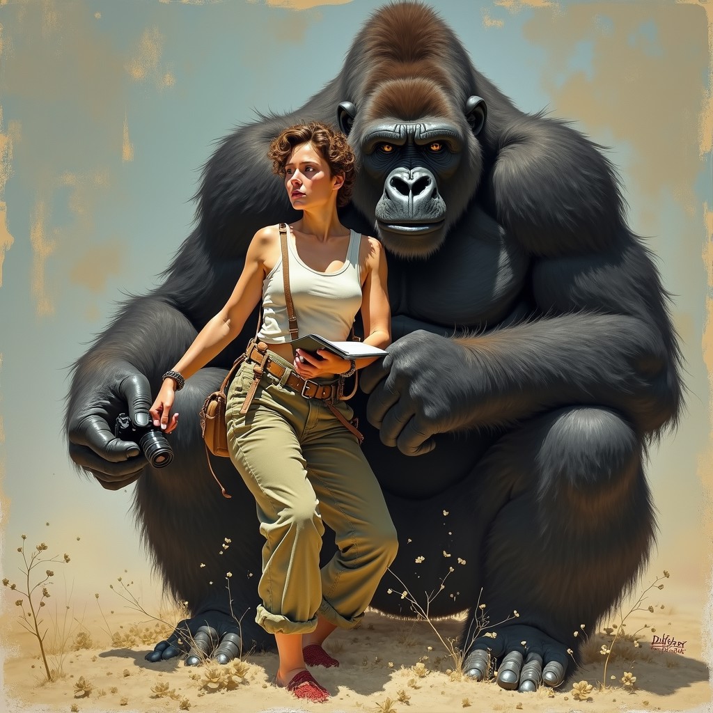 painting by Frank Frazetta, a woman being embraced by a big gorilla, woman being carried, female researcher in durable clothes, writing pad and camera
