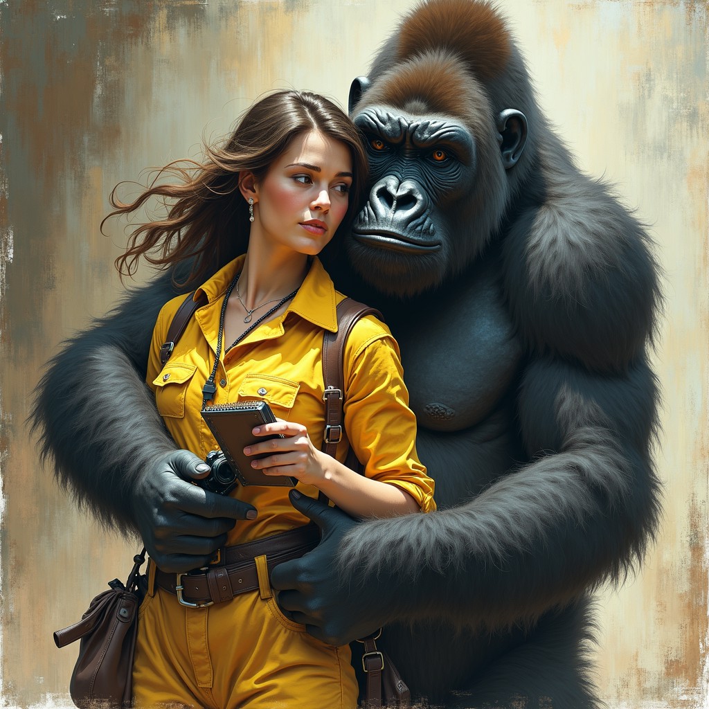 painting by Frank Frazetta, a woman being embraced by a big gorilla, woman being carried, female researcher in durable clothes, writing pad and camera