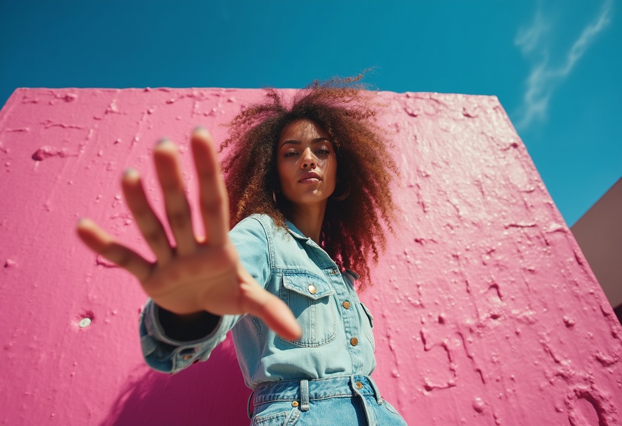 A dynamic fashion shot featuring a female model with curly hair standing in front of a bold, textured pink wall. She extends her hand toward the camera, creating a sense of depth and interaction with the viewer. The image is taken from a low angle, giving it a cinematic and powerful feel. The bright blue sky contrasts with the vivid pink wall, creating a striking backdrop. The model wears casual, modern clothing, with a relaxed yet confident expression. The mood is vibrant, edgy, and fashion-forward, with a playful and artistic composition.