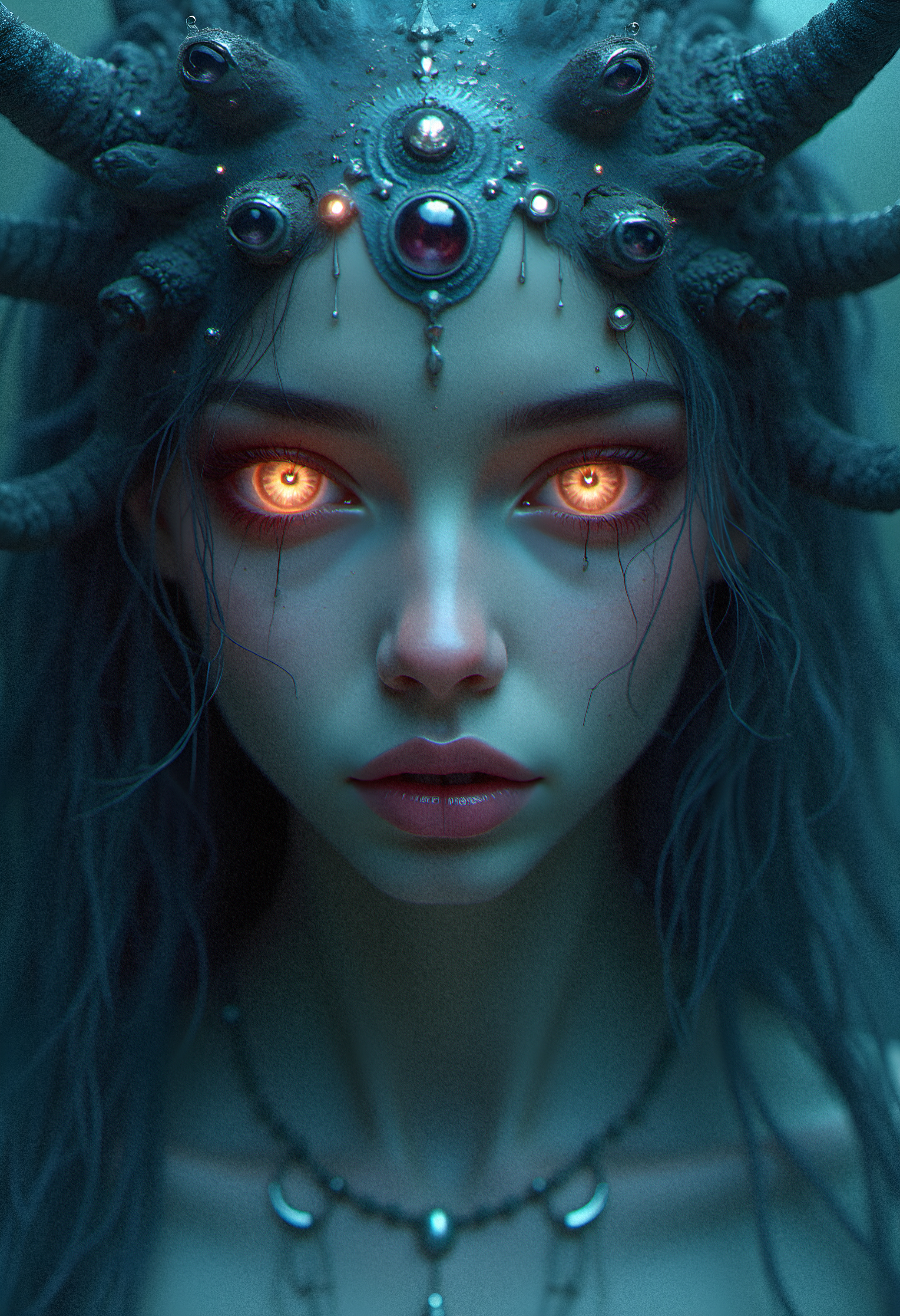 ethereal fantasy concept art of extreme closeup, beautiful woman with six eyes staring into your soul, glowing eyes, cold expression, wither, lost kingdom, eternal . magnificent, celestial, ethereal, painterly, epic, majestic, magical, fantasy art, cover art, dreamy