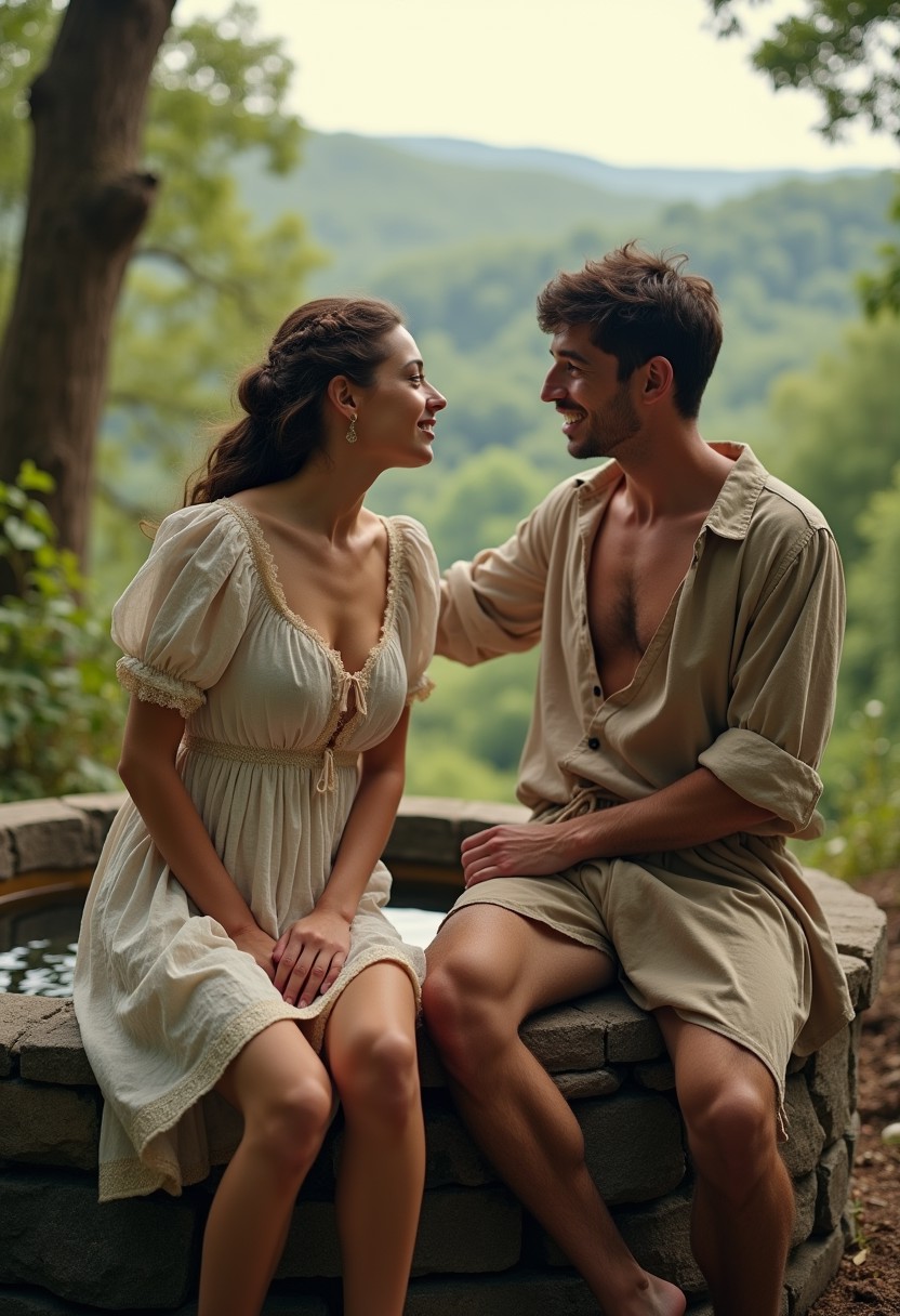 A young cute woman sitting on a stone well, dressed in a short torn summer dress from the 18th century, a man is next to her, smiling lasciviously and touching her, ripping off her dress, the woman looks frightened and ashamed and surprised, cinematic light, breathtaking landscape, shallow depth of field