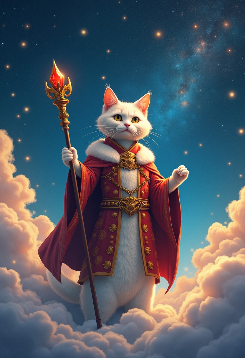 1 standing cat emperor holding a scepter,standing on the clouds,the background is a very dreamy color of the universe starry sky,style of Daniel Spacek, Jakub Rozalski, Simon Stalenhag.