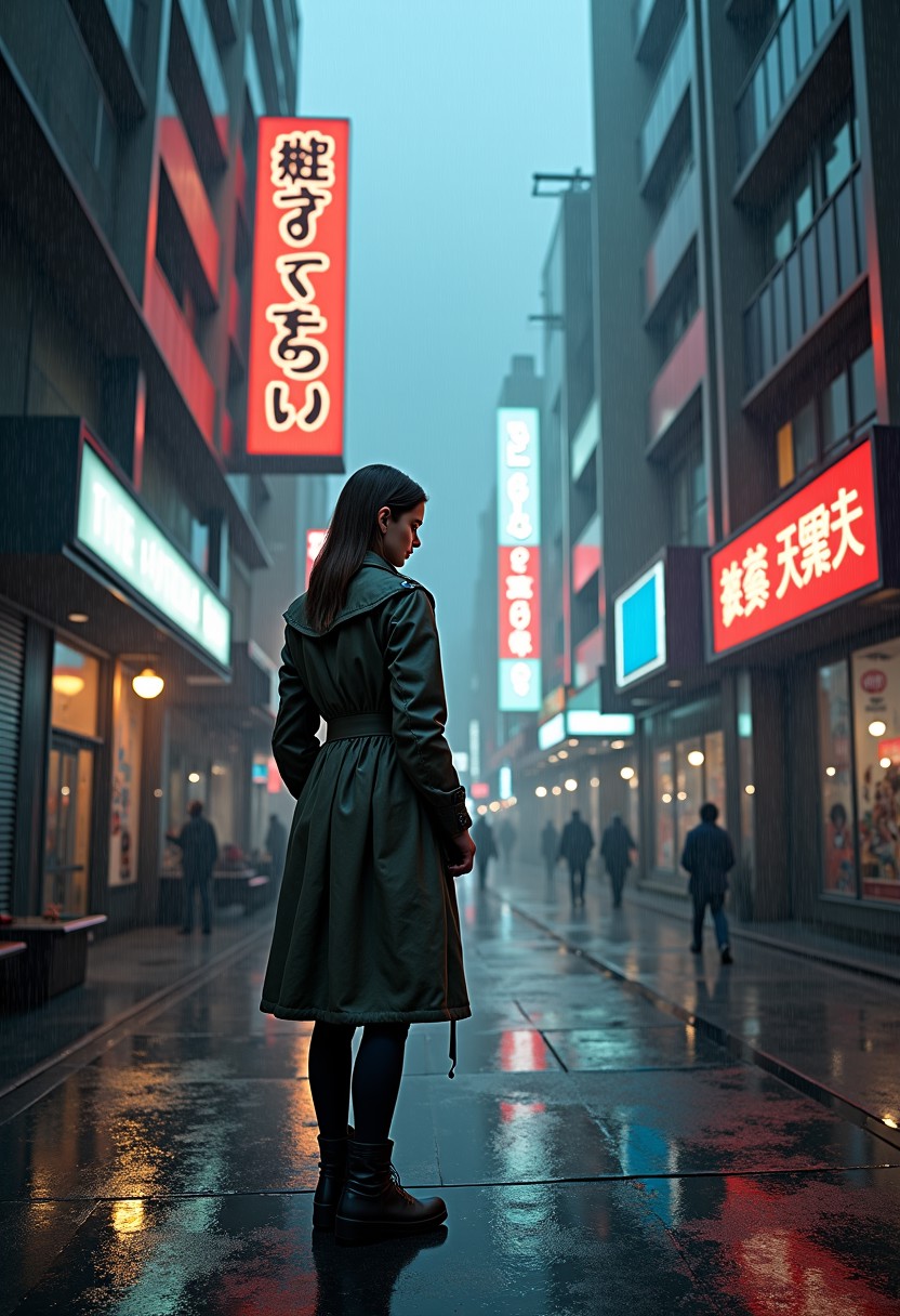 {photorealistic}, raw photo, a lone woman standing in a rain-soaked alleyway, surrounded by tall, neon-lit buildings with flickering signs. The atmosphere is gloomy and oppressive, with dark clouds overhead and rain pouring down, creating reflections on the wet pavement. The woman should have a melancholic expression, wearing a futuristic trench coat and looking down. The background should include elements like cybernetic street vendors, flying drones, and graffiti on the walls, enhancing the dystopian feel of the scene, focus on woman