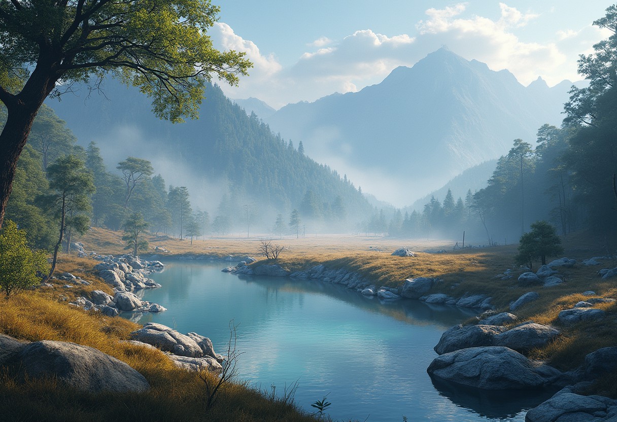 Ink Fill Style, Winter Day, Jungle, Lakes, Hole in Mountains, Tree, Grassy Fields, Rocks, Hot Springs, Hydrosphere, Epic Composition, Realistic Lighting, High Definition Detail, Masterpiece, Best Quality, (High Detail CG 8k Wallpaper)