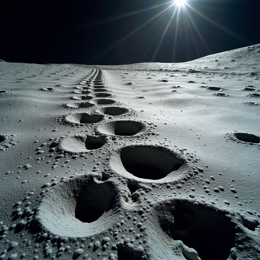 a moon surface huge walking trace of a boot with written text ("one small step")