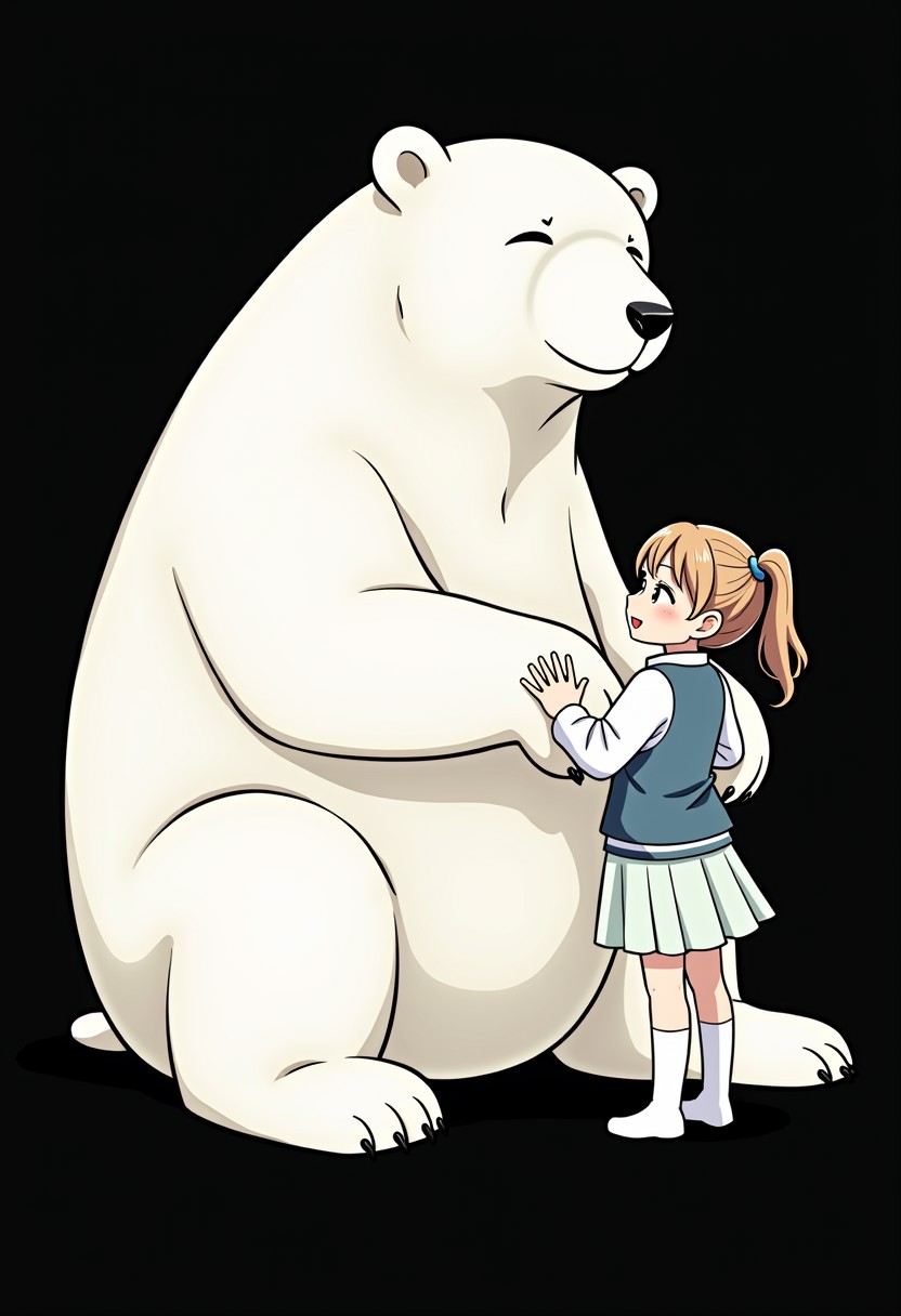 Vivid,S2, a [white polar bear], with its head slightly tilted to the left, adding a touch of (kind_smile) to the scene. The background is [black], highlighting the (figures) of the girl and the polar bear, making the overall composition (simple yet powerful).