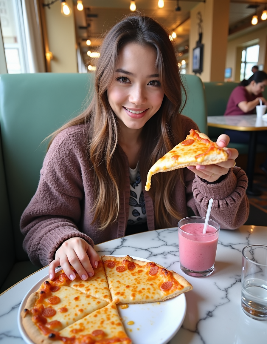a young woman eating pizza. There is an unfinished pizza and a smoothie on the table.