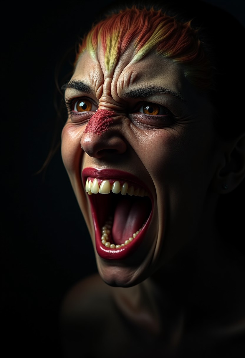 A hyperrealistic, ultra-detailed portrait of a screaming women with razor-sharp teeth, vibrant plumage, beady eyes filled with terror, set against a pitch-black background. Studio lighting emphasizes its menacing expression. Inspired by horror surrealism, evoking an eerie, unsettling atmosphere.