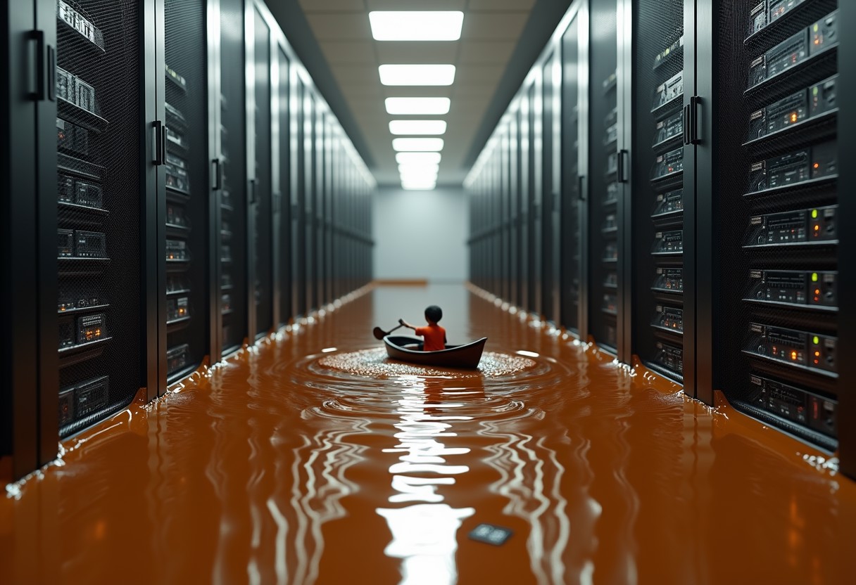 Capture a hyper-realistic photograph of a massive coffee spill on the floor of a server room, with servers floating like boats in a lake of coffee. A floating server displays a message: “Site Drowned in Caffeine – Be back after a cleanup!” A tiny boat with Max in it is rowing through the coffee, trying to rescue the servers. The scene is absurd and funny, with the mess of a spill turned into a dramatic event.