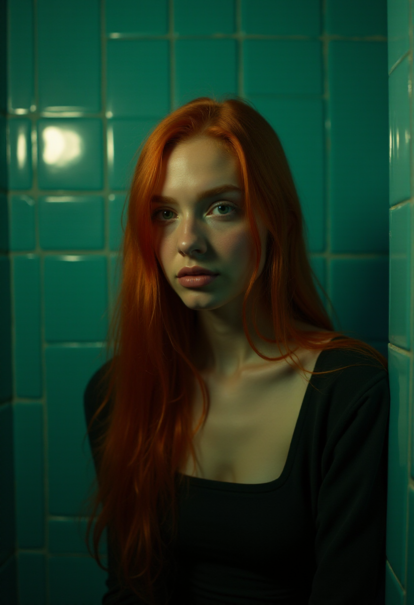 analogue photo cute 23 y/o Ukrainian woman with long red hair, in a small wet tiled room, dimly lit, teal theme, reflection in the tiled wall.amber lights RTX,colormax,