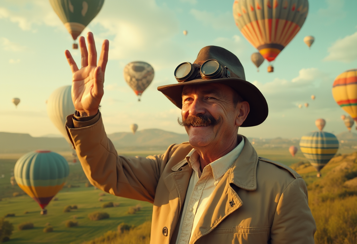 Cinematic wide angle IMAX film still of a movie by Wes Craven. The movie is about a beautiful hot air balloon festival. A cheerful man with a handlebar mustache, rosy cheeks, and sun-kissed skin, wearing a vintage leather aviator hat with round goggles perched on top, and a beige jacket, waves enthusiastically to spectators. The candid shot captures a picturesque countryside launch site, with lush green fields and vibrant hot air balloons of various colors rising into a soft, pastel sky. The balloons showcase intricate patterns and detailed stitching. Distant rolling hills create a layered composition, adding depth to the image. The dreamy pastel color grading enhances the warm, nostalgic atmosphere, with high resolution meticulously capturing every detail from the fabric textures to the sunlight glinting off the man’s goggles.