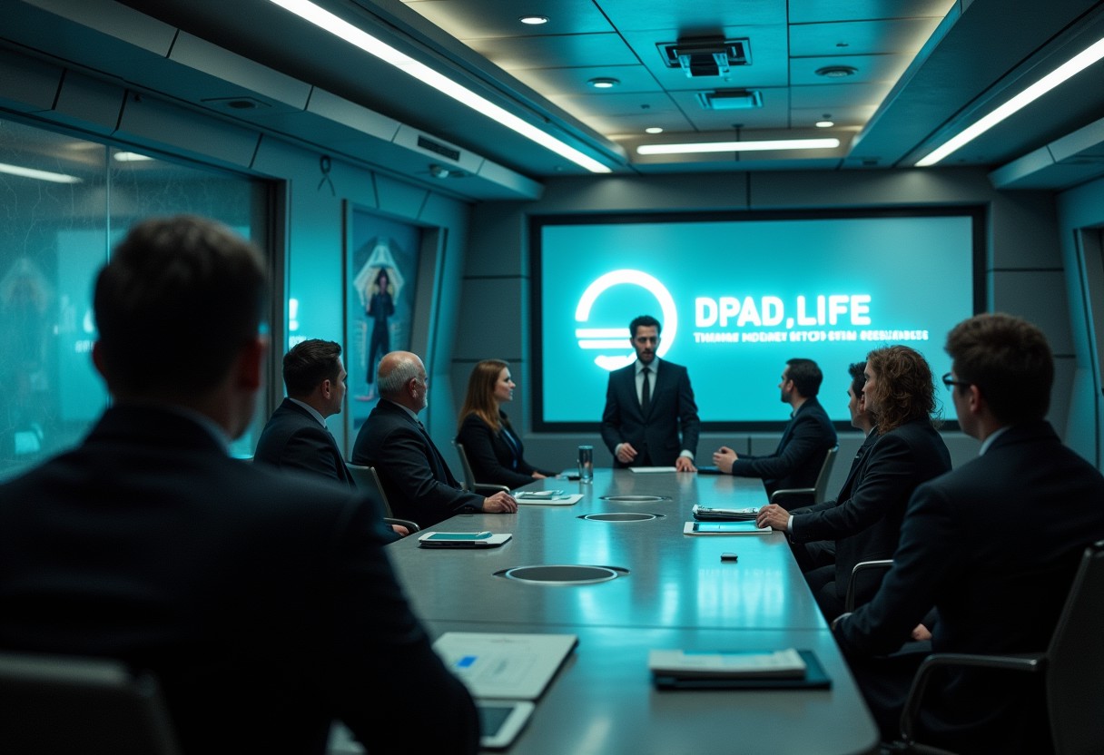 In a sleek, futuristic conference room aboard a Weyland-Yutani spaceship, a medium close-up focuses on a corporate executive delivering a presentation to the crew. The large screen behind him displays a holographic logo of “D-Pad.Life Technologies.” The executive's expression is confident, almost smug, as he outlines the company's latest research initiatives. The crew listens with a mix of skepticism and curiosity, aware of the corporation's history of hidden agendas. The sound of the ship's engines and the distant chatter of crew members create an atmosphere of corporate intrigue. Filmed on 35mm with a cool, sterile color palette, the scene explores themes of corporate greed and manipulation. Directed by Ridley Scott, from Alien: The D-Pad Initiative