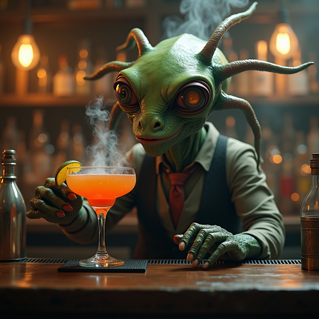 strange alien creature with 5 eyes and tentacles as a bartender in a sci-fi alien bar serving a smoking drink, photo