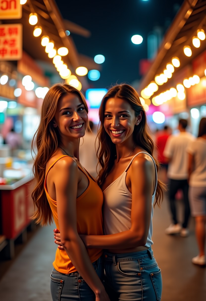 Full-body image of a couple standing side by side at a bustling night market, surrounded by colorful stalls and twinkling lights. Professional photography, high exposure, detailed textures, casual summer clothing, joyful expressions, dynamic background, soft focus on the couple, warm ambient lighting, bustling crowd.